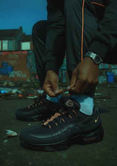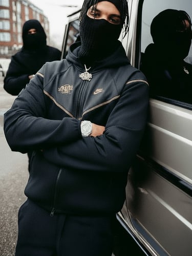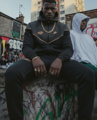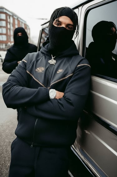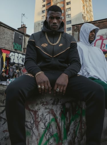 We simulated the look of gritty film photography: muted tones, cinematic shadow, and candid compositions that mirror documentary street culture. The direction leaned into authenticity - hooded figures, tower block backdrops, and raw styling.